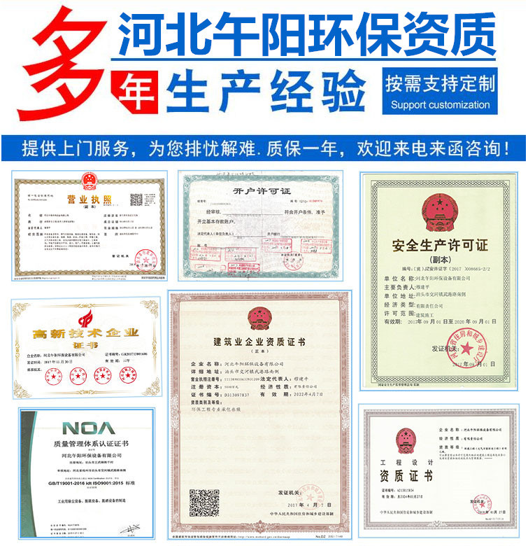 河北午阳环保设备有限公司是一家具有“大气污染fang治工程设计资质”、“环保工程安装资质”,集环保设备的研发、设计、生产、销售、安装调试、运营维护为一体的综合性环保设备公司。