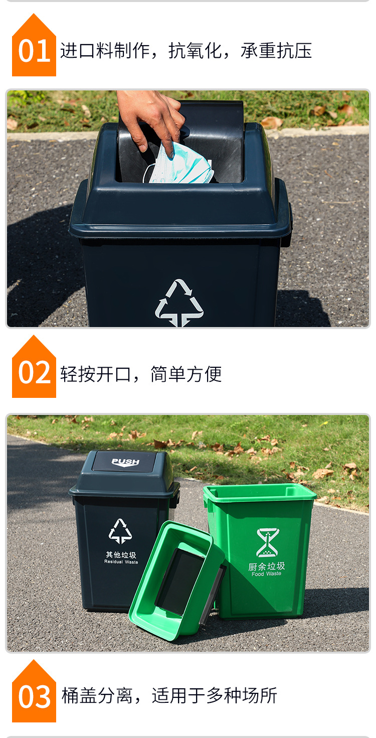 平台首页 > 环卫清洁 > 40L家用摇盖垃圾桶20升长方形按压弹盖筒60l塑料分类翻盖式垃圾桶 3件